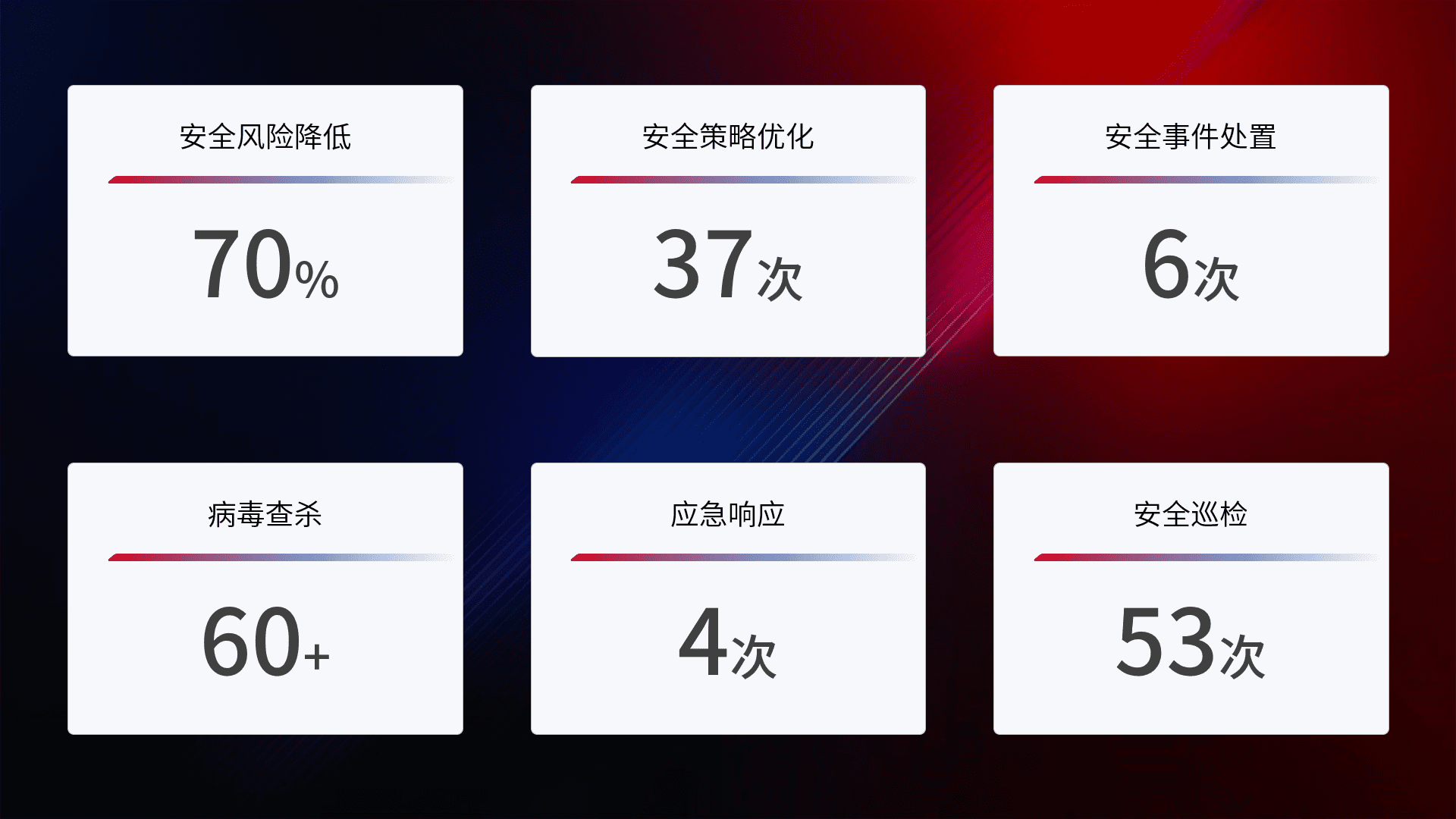 提供全面的安全事件报告体系,,包括处置报告、、、周报、、、季度和年度总结,,结合持续监控,,,帮助客户深入了解网络安全状况。。