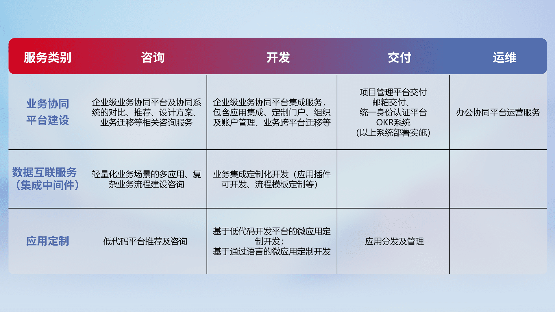 针对钉钉、、企微、、IDaas等平台级产品提供产品的规划、、、方案、、、、交付、、、定制化开发等服务,,,实现如统一协同办公、、智能客户服务、、、、混合会议管理、、、、智能数据查询、、、等业务场景,,,,实现数字化转型。。